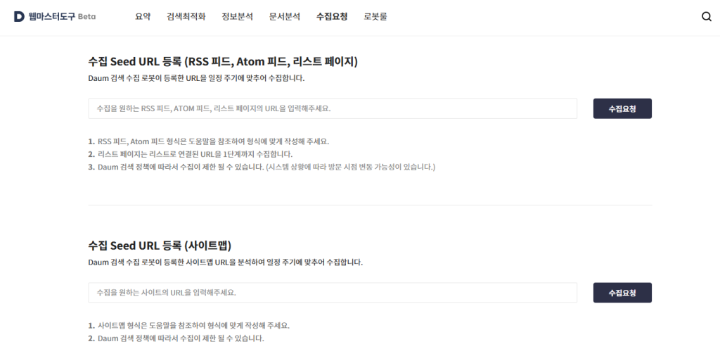 소유권 확인 후에는 다른 검색 엔진과 마찬가지로 사이트맵 주소, RSS 주소를 입력하고 수집요청 버튼을 누르면 된다.