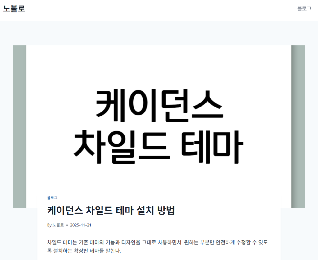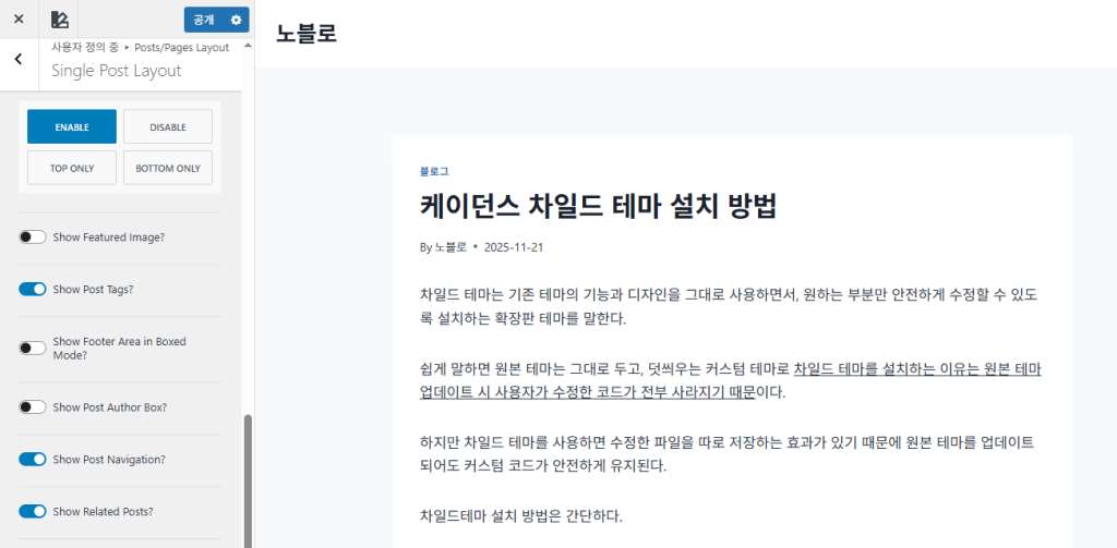 버튼 한번만 누르면 글 안에서 더 이상 썸네일이 보이지 않는 것을 볼 수 있다. 이외에도 글 제목 레이아웃, 정렬, 카테고리, 태그, 네비게이션, 관련 포스트 등 다양한 설정이 가능하다.