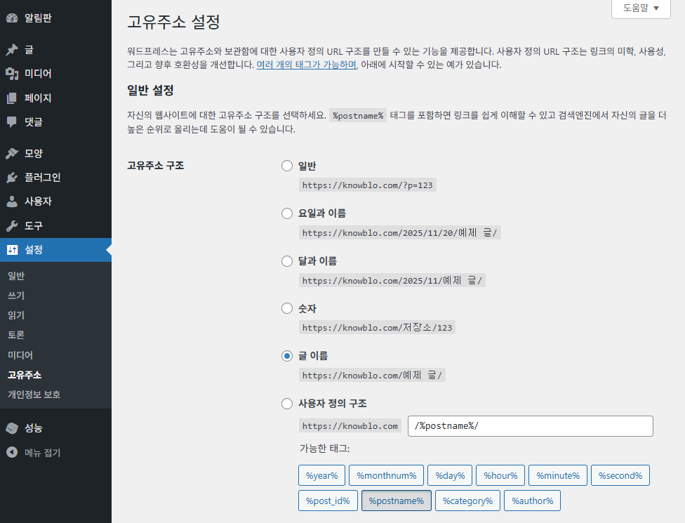 참고로 ‘사용자 정의 구조’는 직접 URL 구조를 정의하는 방식으로 SEO에 강력하지만, 카테고리 변경, 다국어 추가 등 변경이 필요한 경우 유지보수 부담이 크다.